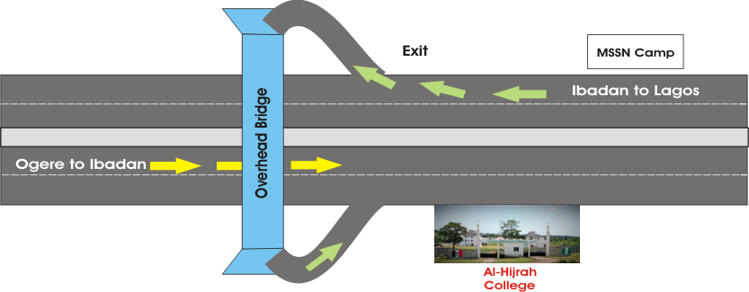 FROM IBADAN: Al-Hijrah College is approximately 15 minutes of normal traffic after the old Toll Gate driving to Lagos. We area about a minute away from the MSSN Camp. The school will be on your left hand side as you drive to Lagos. You will need to make a U-Turn on the next exit on your right, climbing the overhead bridge.